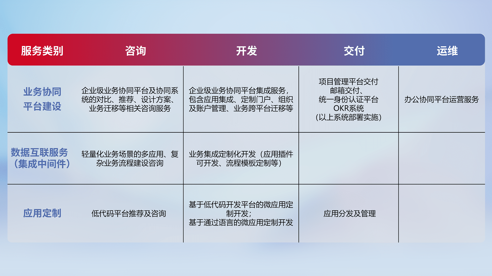 针对钉钉、、企微、、、IDaas等平台级产品提供产品的规划、、、方案、、、交付、、定制化开发等服务,,,实现如统一协同办公、、智能客户服务、、混合会议管理、、智能数据查询、、等业务场景,,,,实现数字化转型。。。